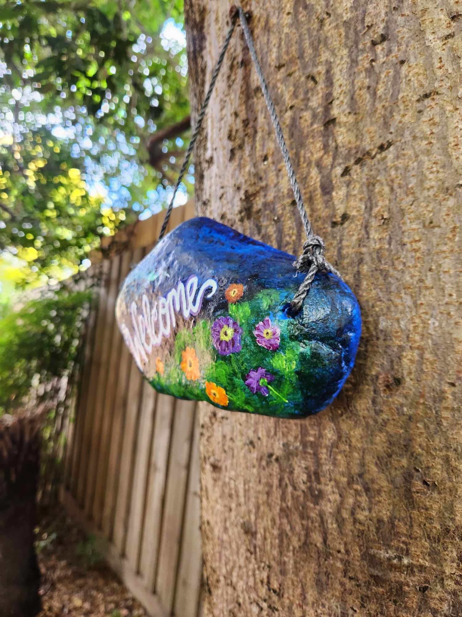 Large Welcome Rock, adorned with a charming hummingbird and vibrant flowers. This solid, weighty rock comes with pre-drilled holes and sturdy twine for your choice of hanging or garden placement - perfect for entrances!
