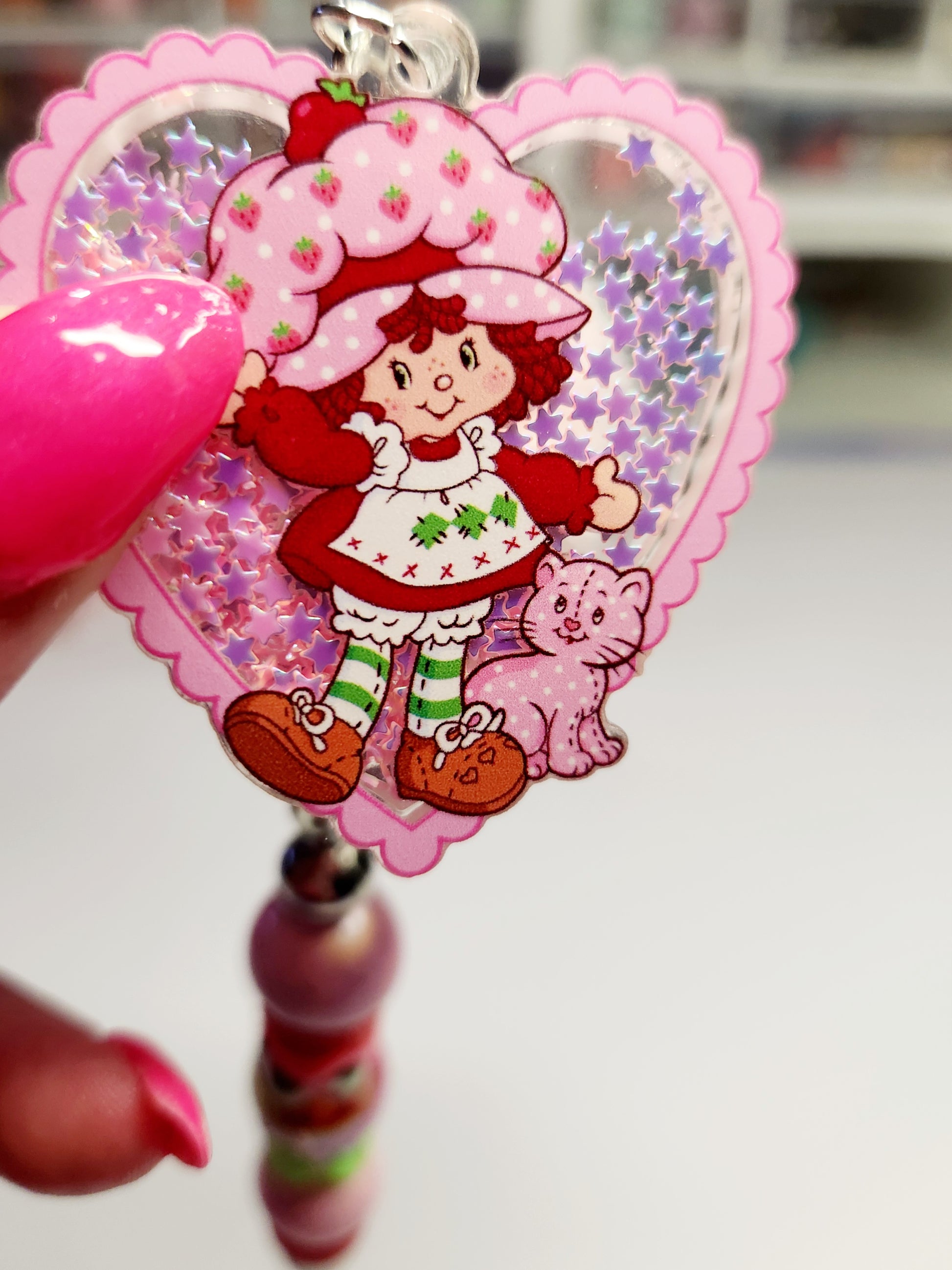 Add some fun to your keychain with our Strawberry Shortcake Keychains! The shaker acrylic design features confetti pieces that move around, while the hand-beaded colors perfectly complement the image. Plus, each keychain is finished with a cute pom pom. Can also be used as a bag charm Make a sweet statement with these keychains.